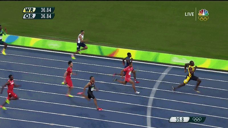 Usain Bolt has completed the unprecedented feat of winning the 100m, 200m, and 4x100m relay in three straight Olympics, anchoring Jamaica to a 37.27 tonight and, with Nickel Ashmeade, Yohan Blake, and Asafa Powell, beating Japan by 0.33 seconds. The U.S. claimed bronze, two hundredths of a second behind Japan.